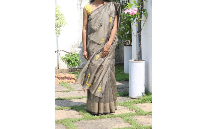 Golden black silky kota saree with golden yellow cross stitch patches done around. Saree fall done